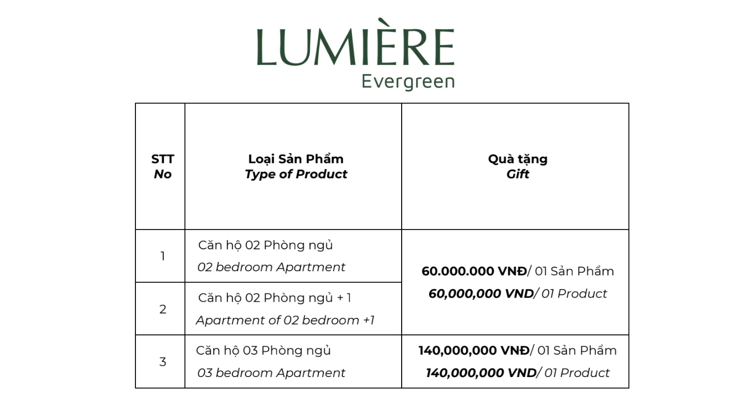 Dự án LUMIÈRE Evergreen hiện tại có phương thức thanh toán linh hoạt, khách hàng có thể lựa chọn giải pháp tài chính phù hợp với tài chính. Dưới đây là chính sách áp dụng cho dự án LUMIÈRE Evergreen tháng 11/2024. Chính sách thanh toán và tiến độ thanh toán dự kiến này áp dụng đối với các giao dịch mà khách hàng đã Đăng Ký Thành Công kể từ ngày 01/11/2024 cho đến ngày 30/11/2024 hoặc đến khi có chính sách khác thay thế (tùy thời điểm nào đến trước).